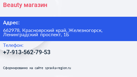 Beauty, магазин по адресу 662978, Красноярский край, Железногорск, Ленинградский проспект, 1Б в дальнейшем Организация, размещена в следующих категориях:
