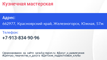 Кузнечная мастерская по адресу 662977, Красноярский край, Железногорск, Южная, 57ж в дальнейшем Организация, размещена в следующих категориях: