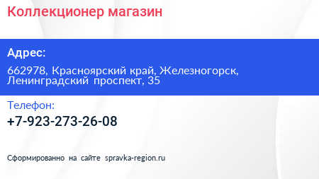 Коллекционер, магазин по адресу 662978, Красноярский край, Железногорск, Ленинградский проспект, 35 в дальнейшем Организация, размещена в следующих категориях: