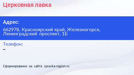 Церковная лавка по адресу 662978, Красноярский край, Железногорск, Ленинградский проспект, 1Б в дальнейшем Организация, размещена в следующих категориях: