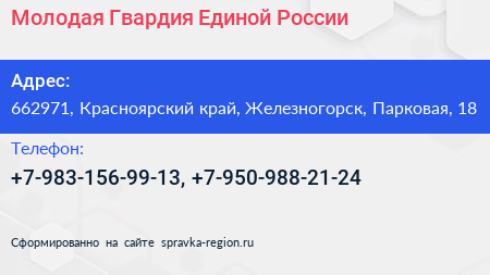 Молодая Гвардия Единой России по адресу 662971, Красноярский край, Железногорск, Парковая, 18 в дальнейшем Организация, размещена в следующих категориях: