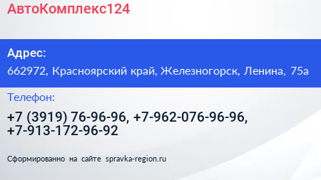 АвтоКомплекс124 по адресу 662972, Красноярский край, Железногорск, Ленина, 75а в дальнейшем Организация, размещена в следующих категориях: