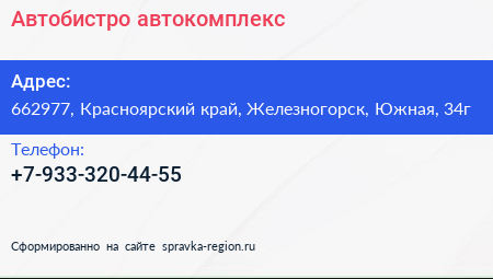Автобистро, автокомплекс по адресу 662977, Красноярский край, Железногорск, Южная, 34г в дальнейшем Организация, размещена в следующих категориях: