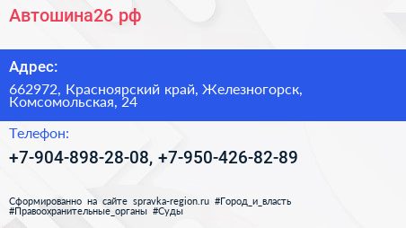 Автошина26.рф по адресу 662972, Красноярский край, Железногорск, Комсомольская, 24 в дальнейшем Организация, размещена в следующих категориях: