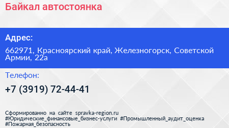 Байкал, автостоянка по адресу 662971, Красноярский край, Железногорск, Советской Армии, 22а в дальнейшем Организация, размещена в следующих категориях: