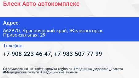 Блеск Авто, автокомплекс по адресу 662970, Красноярский край, Железногорск, Привокзальная, 29 в дальнейшем Организация, размещена в следующих категориях: