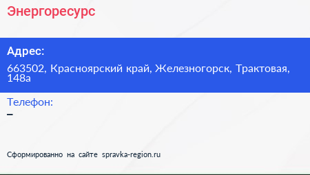 Энергоресурс по адресу 663502, Красноярский край, Железногорск, Трактовая, 148а в дальнейшем Организация, размещена в следующих категориях: