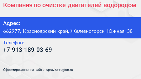 Компания по очистке двигателей водородом по адресу 662977, Красноярский край, Железногорск, Южная, 38 в дальнейшем Организация, размещена в следующих категориях: