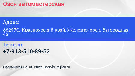 Озон, автомастерская по адресу 662970, Красноярский край, Железногорск, Загородная, 4а в дальнейшем Организация, размещена в следующих категориях: