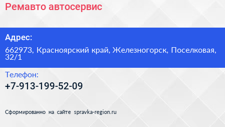 Ремавто, автосервис по адресу 662973, Красноярский край, Железногорск, Поселковая, 32/1 в дальнейшем Организация, размещена в следующих категориях: