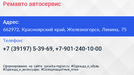 Ремавто, автосервис по адресу 662972, Красноярский край, Железногорск, Ленина, 75 в дальнейшем Организация, размещена в следующих категориях: