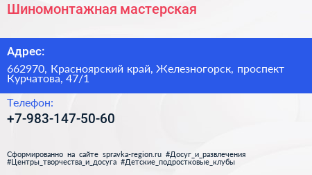 Шиномонтажная мастерская по адресу 662970, Красноярский край, Железногорск, проспект Курчатова, 47/1 в дальнейшем Организация, размещена в следующих категориях:
