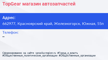 TopGear, магазин автозапчастей по адресу 662977, Красноярский край, Железногорск, Южная, 55п в дальнейшем Организация, размещена в следующих категориях:
