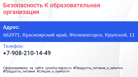 Безопасность-К, образовательная организация по адресу 662971, Красноярский край, Железногорск, Крупской, 11 в дальнейшем Организация, размещена в следующих категориях: