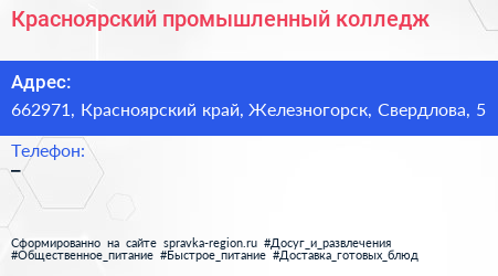 Красноярский промышленный колледж по адресу 662971, Красноярский край, Железногорск, Свердлова, 5 в дальнейшем Организация, размещена в следующих категориях: