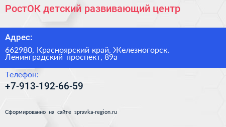 РостОК, детский развивающий центр по адресу 662980, Красноярский край, Железногорск, Ленинградский проспект, 89а в дальнейшем Организация, размещена в следующих категориях: