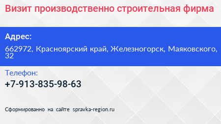 Визит, производственно-строительная фирма по адресу 662972, Красноярский край, Железногорск, Маяковского, 32 в дальнейшем Организация, размещена в следующих категориях: