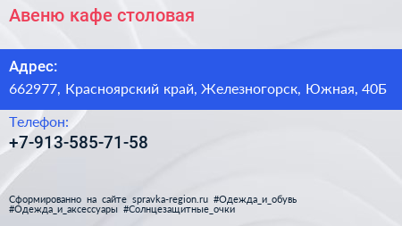 Авеню, кафе-столовая по адресу 662977, Красноярский край, Железногорск, Южная, 40Б в дальнейшем Организация, размещена в следующих категориях:
