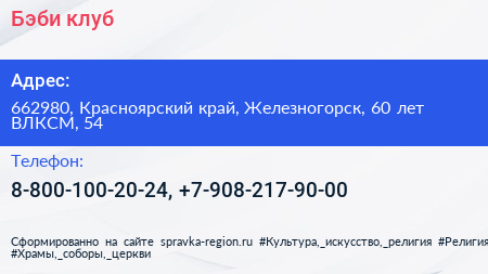 Бэби-клуб по адресу 662980, Красноярский край, Железногорск, 60 лет ВЛКСМ, 54 в дальнейшем Организация, размещена в следующих категориях: