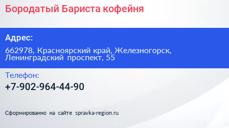Бородатый Бариста, кофейня по адресу 662978, Красноярский край, Железногорск, Ленинградский проспект, 55 в дальнейшем Организация, размещена в следующих категориях: