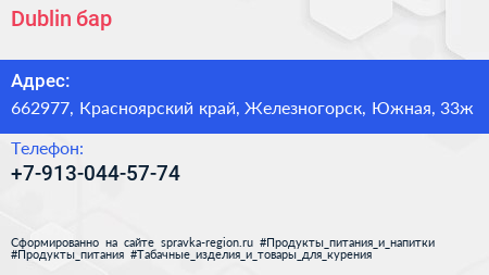 Dublin, бар по адресу 662977, Красноярский край, Железногорск, Южная, 33ж в дальнейшем Организация, размещена в следующих категориях: