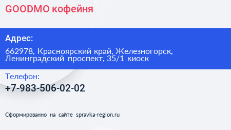 GOODMO, кофейня по адресу 662978, Красноярский край, Железногорск, Ленинградский проспект, 35/1 киоск в дальнейшем Организация, размещена в следующих категориях: