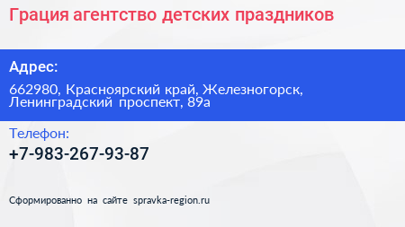 Грация, агентство детских праздников по адресу 662980, Красноярский край, Железногорск, Ленинградский проспект, 89а в дальнейшем Организация, размещена в следующих категориях: