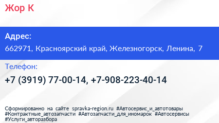 Жор & К по адресу 662971, Красноярский край, Железногорск, Ленина, 7 в дальнейшем Организация, размещена в следующих категориях: