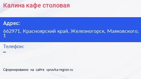 Калина, кафе-столовая по адресу 662971, Красноярский край, Железногорск, Маяковского, 1 в дальнейшем Организация, размещена в следующих категориях: