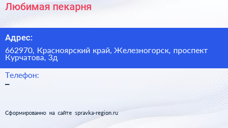 Любимая, пекарня по адресу 662970, Красноярский край, Железногорск, проспект Курчатова, 3д в дальнейшем Организация, размещена в следующих категориях: