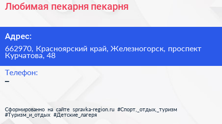 Любимая пекарня, пекарня по адресу 662970, Красноярский край, Железногорск, проспект Курчатова, 48 в дальнейшем Организация, размещена в следующих категориях: