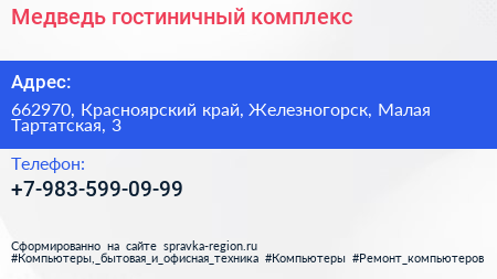 Медведь, гостиничный комплекс по адресу 662970, Красноярский край, Железногорск, Малая Тартатская, 3 в дальнейшем Организация, размещена в следующих категориях: