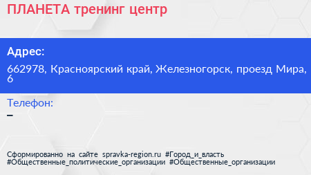 ПЛАНЕТА, тренинг-центр по адресу 662978, Красноярский край, Железногорск, проезд Мира, 6 в дальнейшем Организация, размещена в следующих категориях: