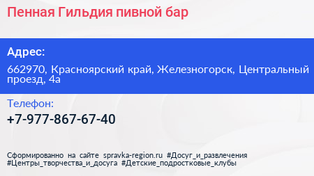 Пенная Гильдия, пивной бар по адресу 662970, Красноярский край, Железногорск, Центральный проезд, 4а в дальнейшем Организация, размещена в следующих категориях: