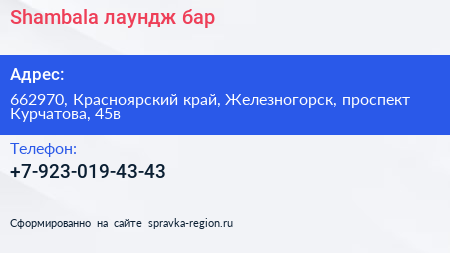 Shambala, лаундж-бар по адресу 662970, Красноярский край, Железногорск, проспект Курчатова, 45в в дальнейшем Организация, размещена в следующих категориях: