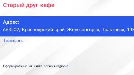 Старый друг, кафе по адресу 663502, Красноярский край, Железногорск, Трактовая, 148 в дальнейшем Организация, размещена в следующих категориях: