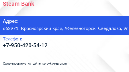 Steam Bank по адресу 662971, Красноярский край, Железногорск, Свердлова, 9г в дальнейшем Организация, размещена в следующих категориях: