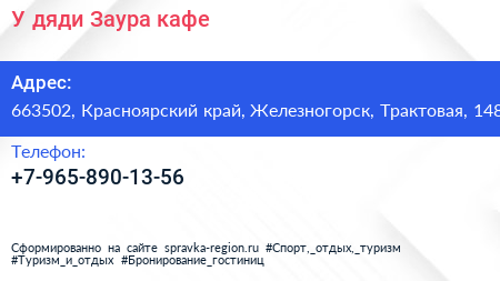 У дяди Заура, кафе по адресу 663502, Красноярский край, Железногорск, Трактовая, 148 в дальнейшем Организация, размещена в следующих категориях: