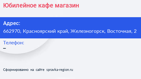 Юбилейное, кафе-магазин по адресу 662970, Красноярский край, Железногорск, Восточная, 2 в дальнейшем Организация, размещена в следующих категориях: