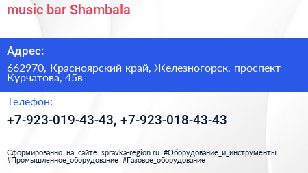 music bar Shambala по адресу 662970, Красноярский край, Железногорск, проспект Курчатова, 45в в дальнейшем Организация, размещена в следующих категориях: