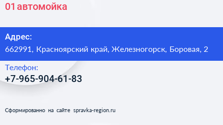 01, автомойка по адресу 662991, Красноярский край, Железногорск, Боровая, 2 в дальнейшем Организация, размещена в следующих категориях: