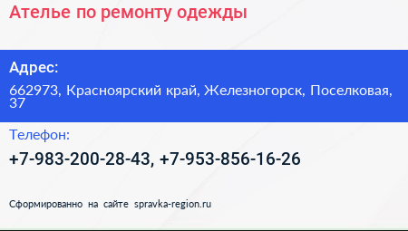 Ателье по ремонту одежды по адресу 662973, Красноярский край, Железногорск, Поселковая, 37 в дальнейшем Организация, размещена в следующих категориях: