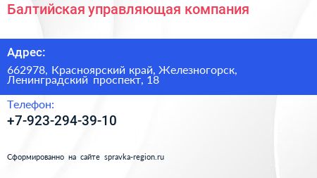 Балтийская, управляющая компания по адресу 662978, Красноярский край, Железногорск, Ленинградский проспект, 18 в дальнейшем Организация, размещена в следующих категориях: