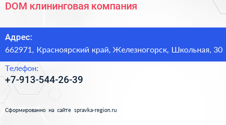 DOM, клининговая компания по адресу 662971, Красноярский край, Железногорск, Школьная, 30 в дальнейшем Организация, размещена в следующих категориях: