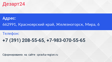 Дезарт24 по адресу 662991, Красноярский край, Железногорск, Мира, 6 в дальнейшем Организация, размещена в следующих категориях: