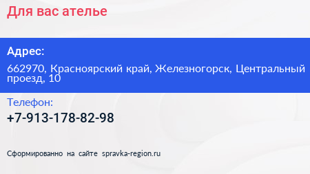 Для вас, ателье по адресу 662970, Красноярский край, Железногорск, Центральный проезд, 10 в дальнейшем Организация, размещена в следующих категориях: