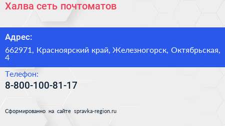 Халва, сеть почтоматов по адресу 662971, Красноярский край, Железногорск, Октябрьская, 4 в дальнейшем Организация, размещена в следующих категориях:
