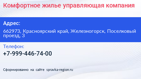 Комфортное жилье, управляющая компания по адресу 662973, Красноярский край, Железногорск, Поселковый проезд, 3 в дальнейшем Организация, размещена в следующих категориях: