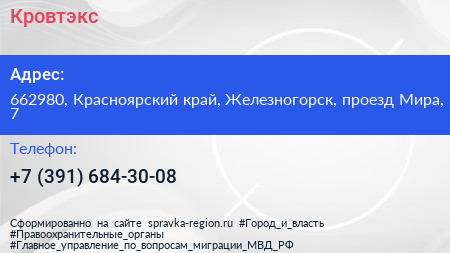 Кровтэкс по адресу 662980, Красноярский край, Железногорск, проезд Мира, 7 в дальнейшем Организация, размещена в следующих категориях:
