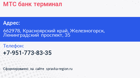 МТС банк, терминал по адресу 662978, Красноярский край, Железногорск, Ленинградский проспект, 35 в дальнейшем Организация, размещена в следующих категориях: